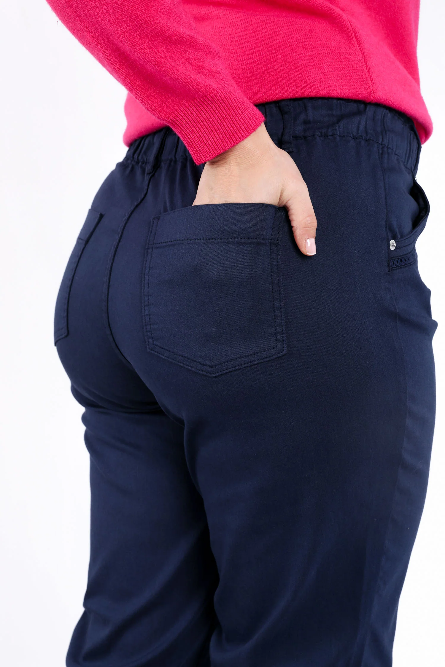 Découvrez notre chino en coton uni, alliant confort et style avec sa taille élastiquée et son cordon à nouer. Ce pantalon léger se distingue par ses poches pratiques et un élégant détail ajouré, parfait pour une allure décontractée et moderne. Sa coupe 7/8 et une entrejambe de 72 cm offrent une silhouette tendance à adopter sans hésiter.